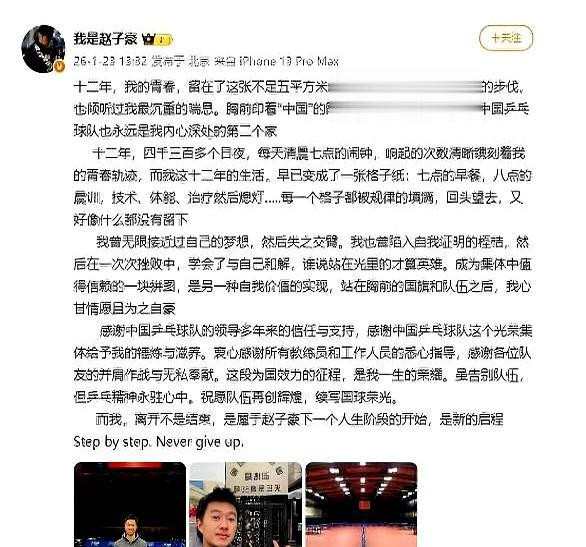 这里面最让人唏嘘的,可能就是赵子豪了。他发了篇长文,说“十二年,我的青春,留在了这张不足五平方米的球台上”。很多人不知道,他不仅仅是个球员,在过去的漫长岁月里,他最重要的一个身份,是樊振东的专属陪练,一个“影子战友”。