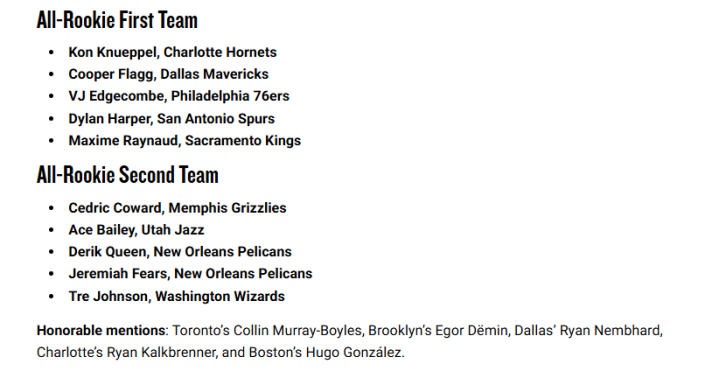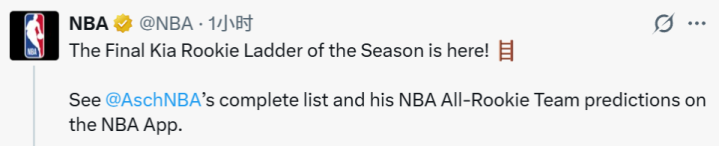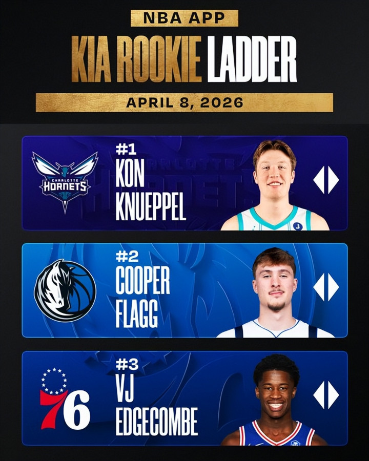 北京时间4月9日,NBA官网公布了最终的2025-26赛季新秀排行榜,本质上相当于一名投票记者公开的年度最佳新秀选票,外加最佳新秀一阵、二阵名单。前三名如下——