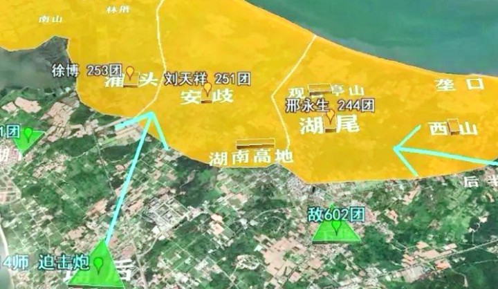 其中:东路担任主攻任务的244团(加上246团一个营)最先出发,由团长兼政委邢永生、参谋长朱斐然、政治处主任孙树亮和246团副团长兼参谋长刘汉斌率领,分别从莲河和大嶝岛的阳塘启航;