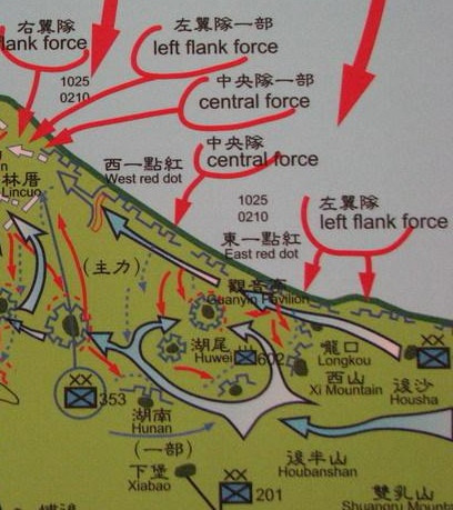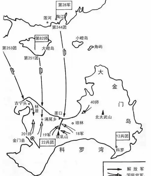 2. 命令已卸船的驻扎琼林的第19军18师就近归18军军长高魁元指挥,连同其第11师(四个团配置的加强师)、第43师由无战事的岛东调往岛西垄口一线,18师尚未卸船的第53团,原船转航小金门归第五军军长李运成指挥,以增强小金门的防卫力量,25军45师则继续留守岛东;