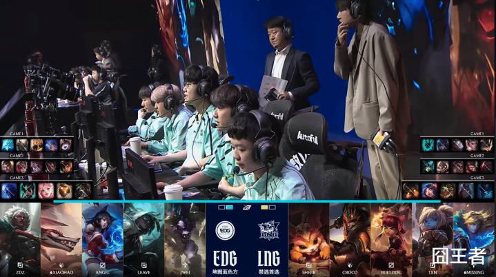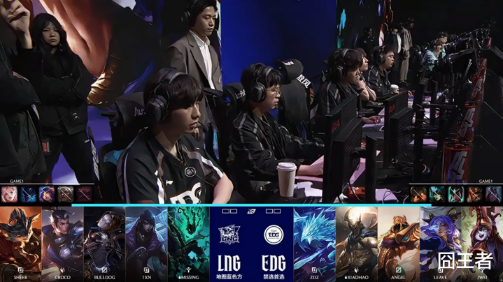 第一局比赛,LNG蓝色方,禁用:歌姬、梦魇、妮蔻、狼母、奥恩,选用:Sheer兰博、Croco赵信、BullDoG发条、1xn月男、Missing锤石;EDG红色方,禁用:泰坦、娜美、扇子妈、皇子、韦鲁斯,选用:Zdz冰鸟、Xiaohao潘森、Angel沙皇、Leave芸阿娜、Jwei露露