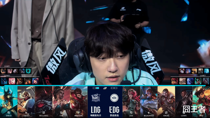 第二局比赛,LNG蓝色方,禁用:梦魇、歌姬、皇子、泰坦、妮蔻,选用:Sheer塞恩、Croco、BullDoG梅尔、1xn飞机、Missing娜美;EDG红色方,禁用:韦鲁斯、扇子妈、瑞兹、狼狗、选用:Zdz杰斯、Xiaohao蔚、Angel兔子、Leave、Jwei