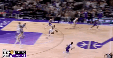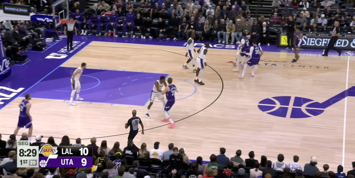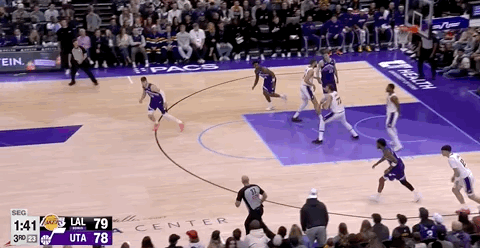 还是以对爵士为例,为什么我选择这场而不是最近对快船,因为本场詹东里+艾顿都在场,这是湖人本赛季在没有惊天大交易情况下的核心四人组,斯马特/八村/拉拉维亚,则会根据比赛场面上的变化来进行搭配。