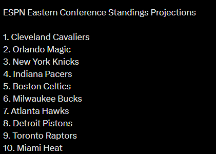 在本赛季开始前,ESPN预测了东部前十的球队排名(见上图)。